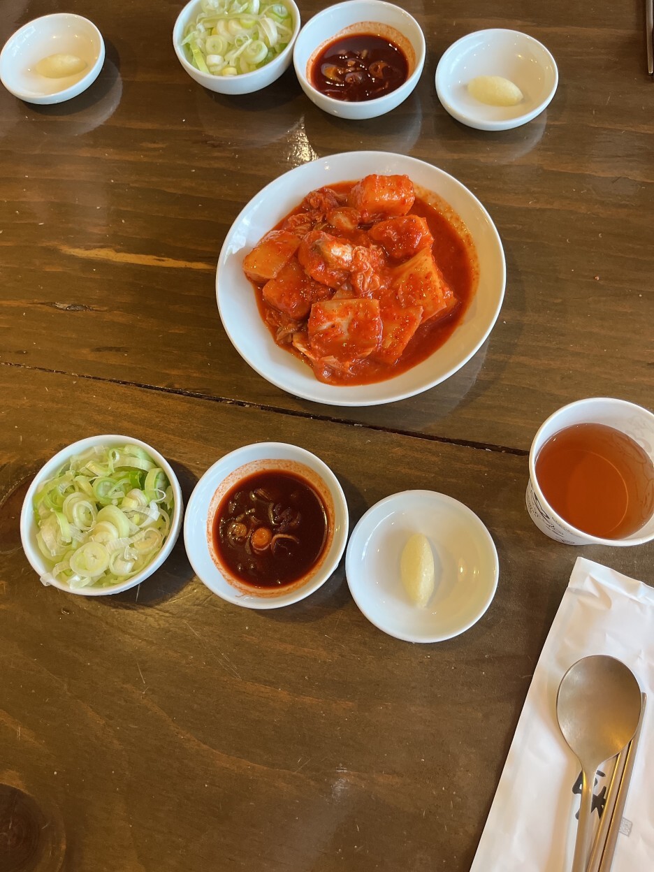 특이한 게 김치+깍두기가 섞인 채로 나오더라고요!
